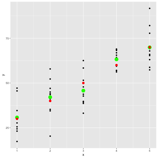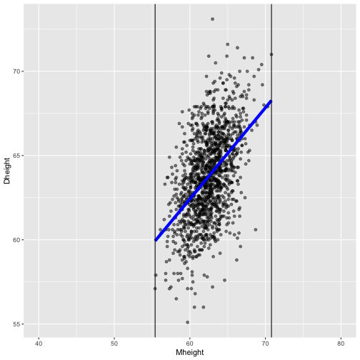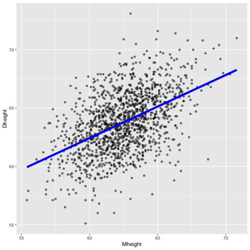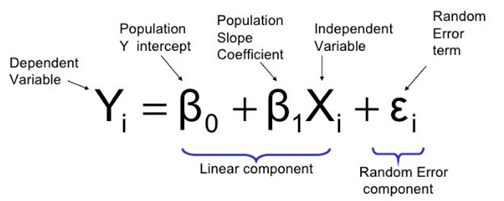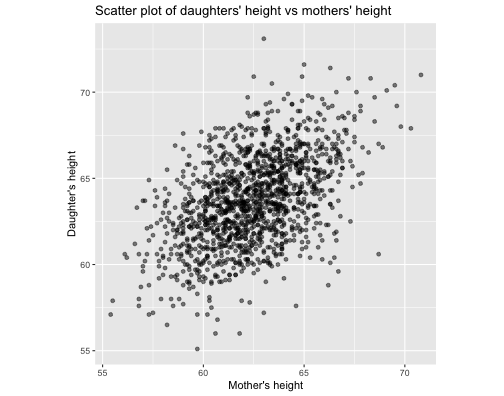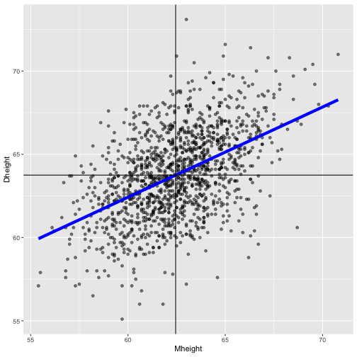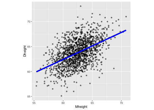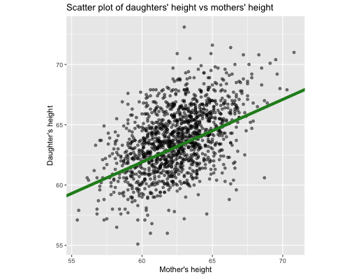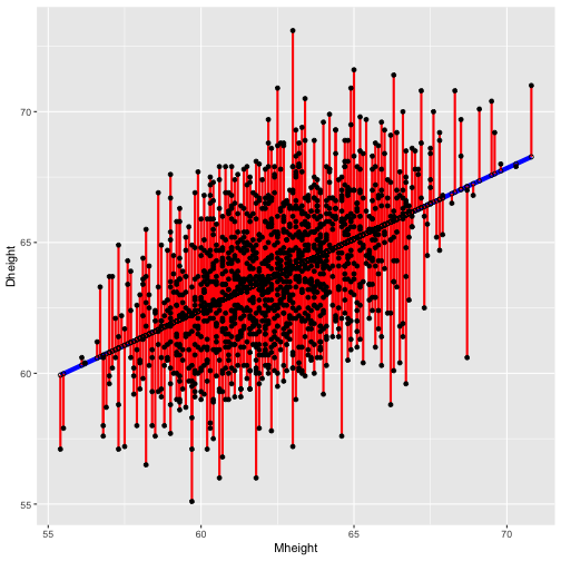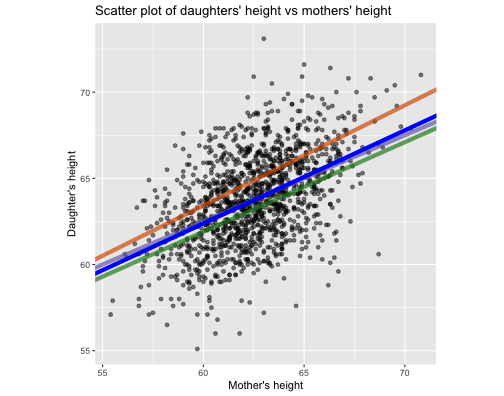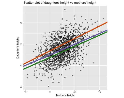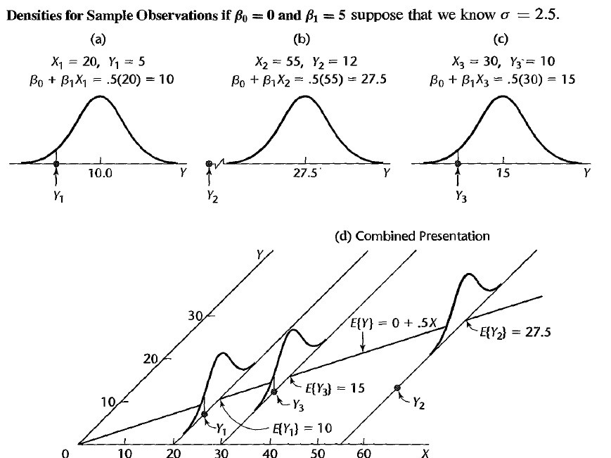 class: center, middle, inverse, title-slide # STA 506 2.0 Linear Regression Analysis ## Lecture 2: Simple Linear Regression ### Dr Thiyanga S. Talagala ### Lesson 2 --- ## Recap: correlation  --- ## Recap: correlation (cont.) .pull-left[  ] .pull-right[ |value |interpretation | |:-------------|:---------------------| |-1 |Perfect negative | |(-1, -0.75) |Strong negative | |(-0.75, -0.5) |Moderate negative | |(-0.5, -0.25) |Weak negative | |(-0.25, 0.25) |No linear association | |(0.25, 0.5) |Weak positive | |(0.5, 0.75) |Moderate positive | |(0.75, 1) |Strong positive | |1 |Perfect positive | ] --- ## Recap: Terminologies - Response variable: dependent variable - Explanatory variables: independent variables, predictors, regressor variables, features (in Machine Learning) > Response variable = Model function + Random Error - Parameter - Statistic - Estimator - Estimate [Read my blogpost](https://thiyanga.netlify.app/post/statterms1/) --- # In-class --- # In-class --- # Simple Linear Regression **Simple** - single regressor **Linear** - parameters enter in a linear fashion. --- # Meaning of Linear Model | What about this? `$$Y = \beta_0 + \beta_1x_1 + \beta_{2}x_2 + \epsilon$$` -- | Linear or nonlinear? `$$Y = \beta_0 + \beta_1x + \beta_{2}x^2 + \epsilon$$` <!--While the independent variable is squared, the model is still linear in the parameters. Linear models can also contain log terms and inverse terms to follow different kinds of curves and yet continue to be linear in the parameters.--> -- | Linear or nonlinear? `$$Y = \beta_0e^{\beta_1x} + \epsilon$$` -- What about this? `$$Y = \alpha X_1^\beta X_2^\gamma X_3^\delta e^\epsilon$$` --- **True relationship between X and Y in the population** `$$Y = f(X) + \epsilon$$` **If `\(f\)` is approximated by a linear function** `$$Y = \beta_0 + \beta_1X + \epsilon$$` The error terms are normally distributed with mean `\(0\)` and variance `\(\sigma^2\)`. Then the mean response, `\(Y\)`, at any value of the `\(X\)` is `$$E(Y|X=x_i) = E(\beta_0 + \beta_1x_i + \epsilon)=\beta_0+\beta_1x_i$$` For a single unit `\((y_i, x_i)\)` `$$y_i = \beta_0 + \beta_1x_i+\epsilon_i \text{ where } \epsilon_i \sim N(0, \sigma^2)$$` We use sample values `\((y_i, x_i)\)` where `\(i=1, 2, ...n\)` to estimate `\(\beta_0\)` and `\(\beta_1\)`. The fitted regression model is `$$\hat{Y_i} = \hat{\beta}_0 + \hat{\beta}_1x_i$$` --- <!-- --> --- ## Population mean <!-- --> --- ## Population mean (red) and sample mean (green) <!-- --> --- ## Population Regression `$$E(Y|X=x_i) = \beta_0+\beta_1x_i$$` <!-- --> --- ## Population regression line and fitted regression line <!-- --> --- ## Normal distribution .pull-left[ <!-- --> ``` [1] 5.008403 ``` ] .pull-left[ <!-- --> ``` [1] 5.082935 ``` ] --- ## Normal distribution .pull-left[ <!-- --> ] .pull-left[ <!-- --> ] --- ### Normal distribution  From: https://towardsdatascience.com/do-my-data-follow-a-normal-distribution-fb411ae7d832 --- ### Normal distribution  From: https://towardsdatascience.com/do-my-data-follow-a-normal-distribution-fb411ae7d832 --- ### Normal distribution  From: https://towardsdatascience.com/do-my-data-follow-a-normal-distribution-fb411ae7d832 --- class: duke-orange, center, middle ## Buckle up! ### Let's walk through the steps. --- ## In-class **True relationship between X and Y in the population** `$$Y = f(X) + \epsilon$$` > --- ## In-class **True relationship between X and Y in the population** `$$Y = f(X) + \epsilon$$` Example: Suppose you want to model daughters' height as a function of mothers' height. Do you think an exact (deterministic) relationship exists between these two variables? --- ## In-class **True relationship between X and Y in the population** `$$Y = f(X) + \epsilon$$` Example: Suppose you want to model daughters' height as a function of mothers' height. Do you think an exact (deterministic) relationship exists between these two variables? > Why? --- ## In-class **True relationship between X and Y in the population** `$$Y = f(X) + \epsilon$$` Example: Suppose you want to model daughters' height as a function of mothers' height. Do you think an exact (deterministic) relationship exists between these two variables? 1. Daughters' height may depend on many other variables than Mothers' height. --- ## In-class **True relationship between X and Y in the population** `$$Y = f(X) + \epsilon$$` Example: Suppose you want to model daughters' height as a function of mothers' height. Do you think an exact (deterministic) relationship exists between these two variables? 1. Daughters' height may depend on many other variables than Mothers' height. 2. Even if many variables are included in the model, it is unlikely that we can predict the daughter's height exactly. Why? --- ## In-class **True relationship between X and Y in the population** `$$Y = f(X) + \epsilon$$` Example: Suppose you want to model daughters' height as a function of mothers' height. Do you think an exact (deterministic) relationship exists between these two variables? 1. Daughters' height may depend on many other variables than Mothers' height. 2. Even if many variables are included in the model, it is unlikely that we can predict the daughter's height exactly. Why? There will almost certainly be some variations in the model predictions that cannot be modelled, or explained. These unexplained variances are assumed to be caused by the unexplainable random phenomena, so they can be referred to as random error. --- ## In-class --- ## In-class: Population Regression Line **True relationship between X and Y in the population** `$$Y = f(X) + \epsilon$$` **If `\(f\)` is approximated by a linear function** `$$Y = \beta_0 + \beta_1X + \epsilon$$` The error terms are normally distributed with mean `\(0\)` and variance `\(\sigma^2\)`. Then the mean response, `\(Y\)`, at any value of the `\(X\)` is `$$E(Y|X=x_i) = E(\beta_0 + \beta_1x_i + \epsilon)=\beta_0+\beta_1x_i$$` ---  ---  source: http://digfir-published.macmillanusa.com/psbe4e/psbe4e_ch10_2.